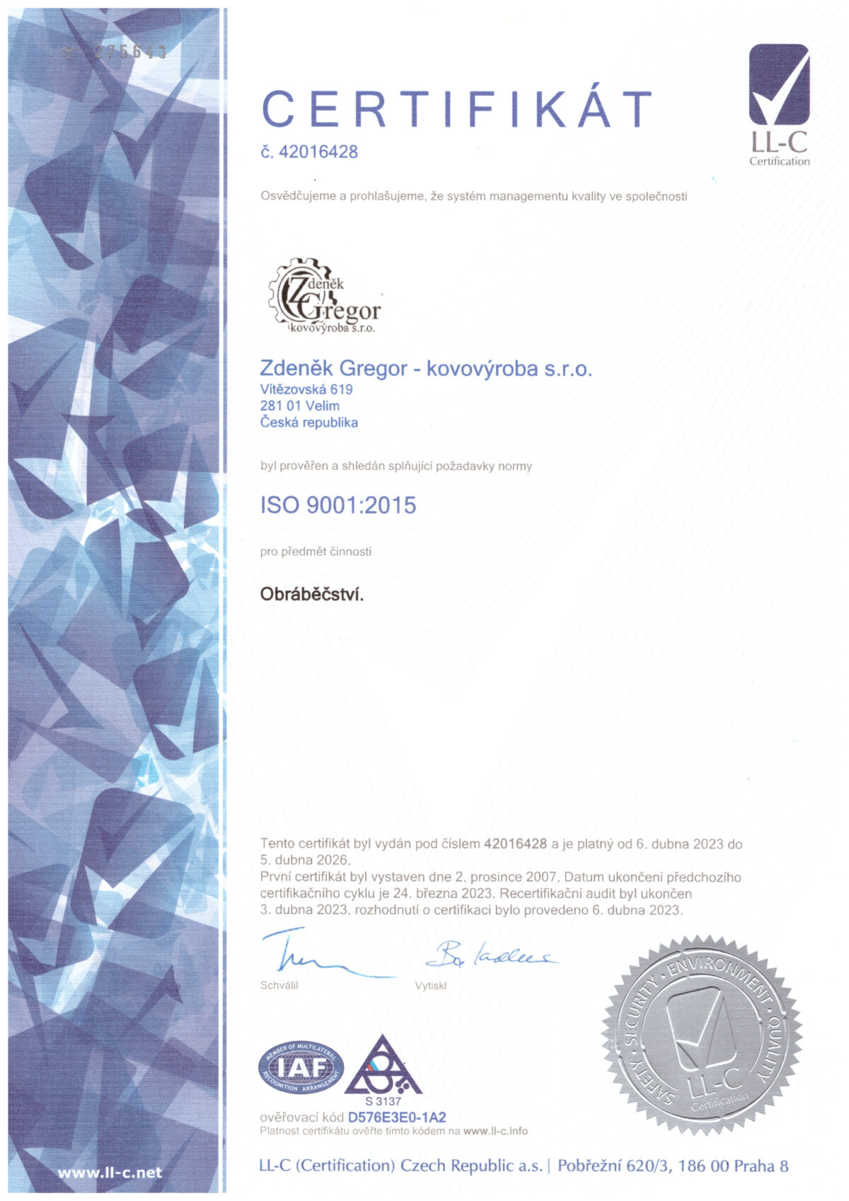 Ab 30.12. 2016 haben wir die Rechtsform in eine Gesellschaft mit beschränkter Haftung Zdeněk Gregor – kovovýroba s.r.o. (Metallproduktion) geändert.